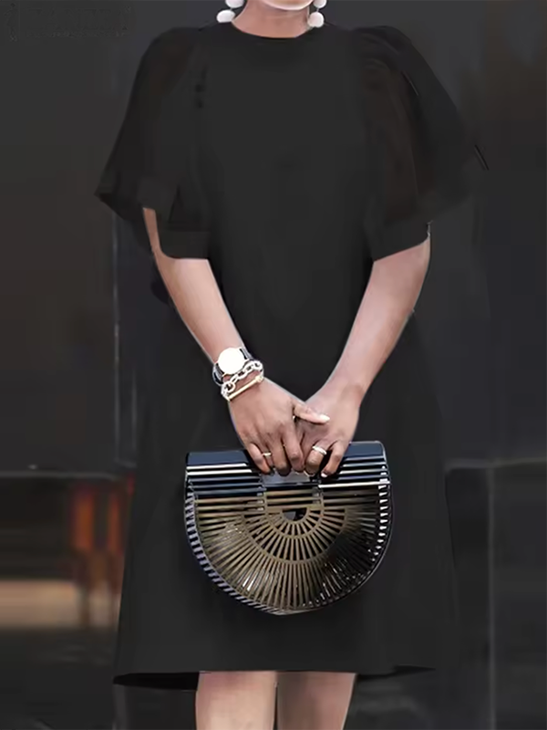 Short Sleeves Pleated See-Through Solid Color Split-Joint Round-Neck Mini Dresses