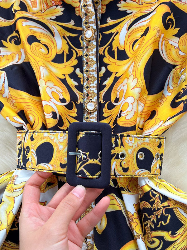 Sleeveless Belt Buckle Buttoned Contrast Color Floral Printed Midi Dresses